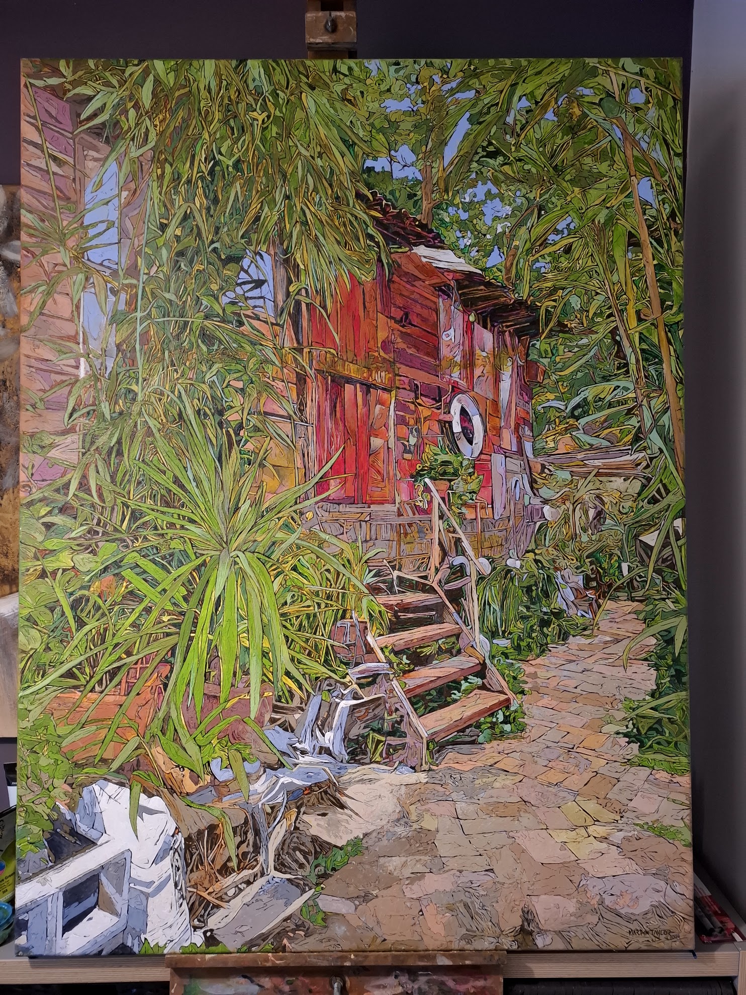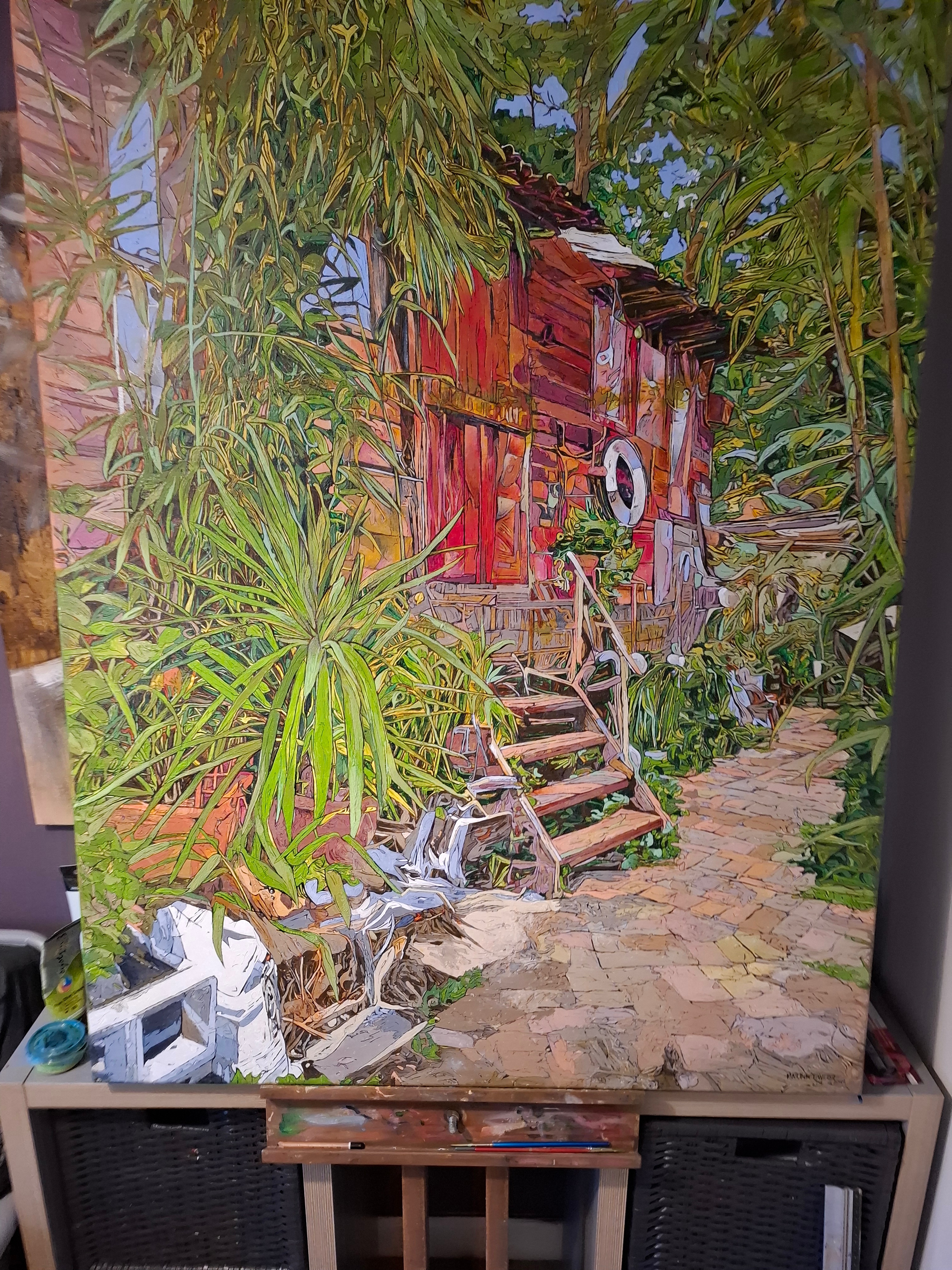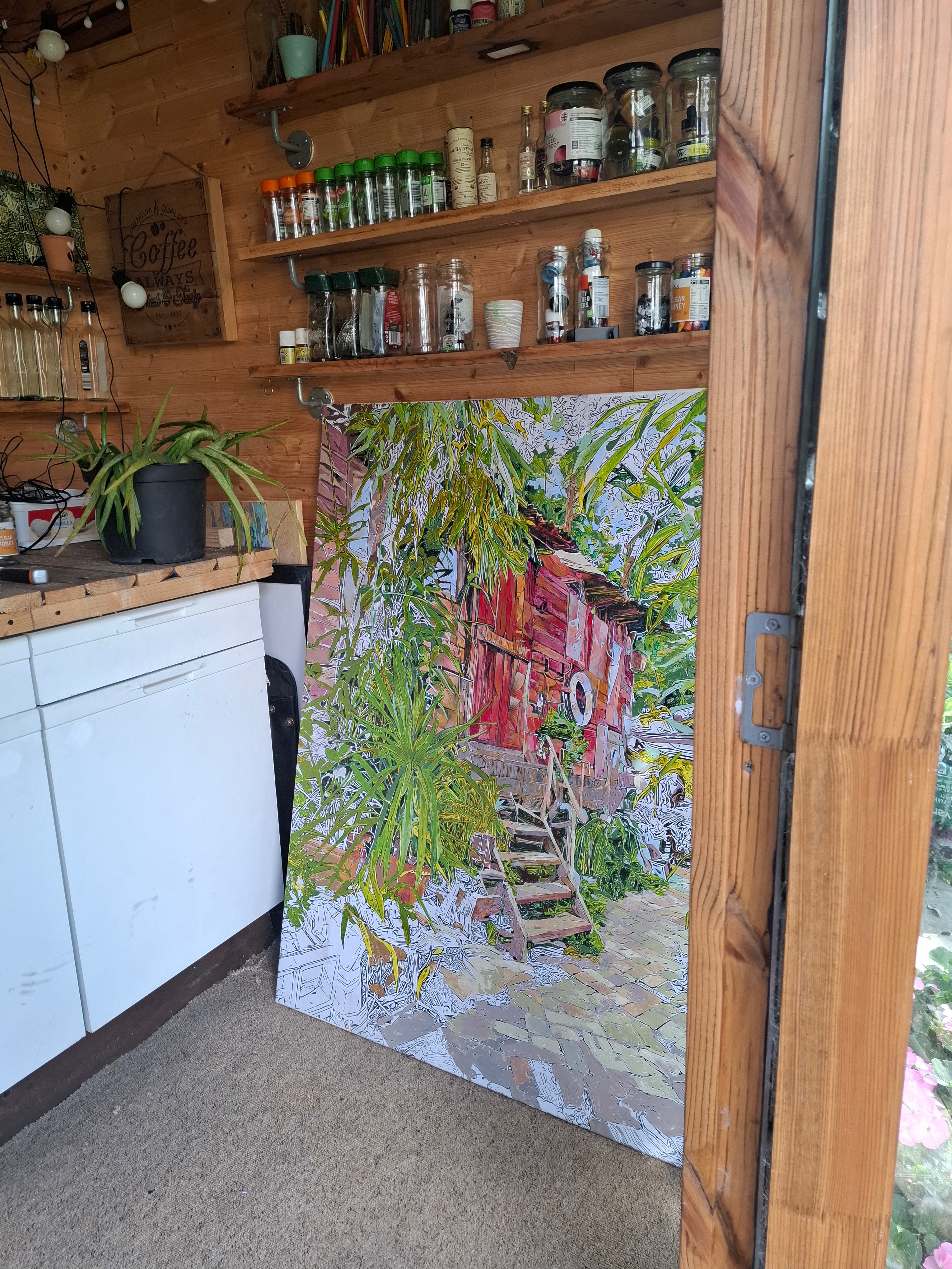 It gave me the inspiration to paint larger works onto canvas but using the them of quirky gardens and workspaces. As we walked around the island it felt so familiar and after half an hour it came to me that it reminded me of our visits to the Bahamas and the The Great Guana Cay Islands and the community feeling and remoteness but relaxed atmosphere. It is so different to anywhere else in London just by crossing a small footbridge.