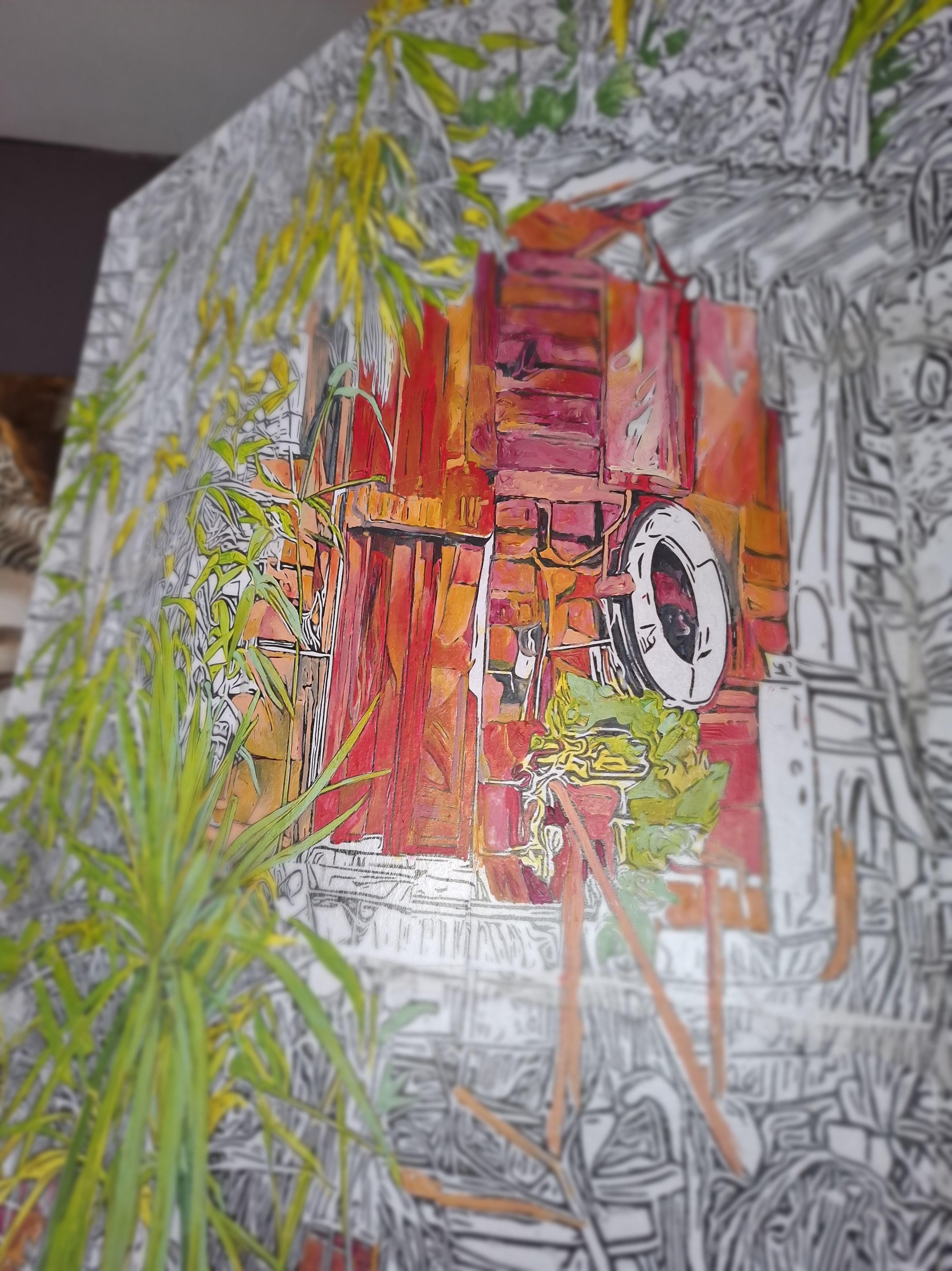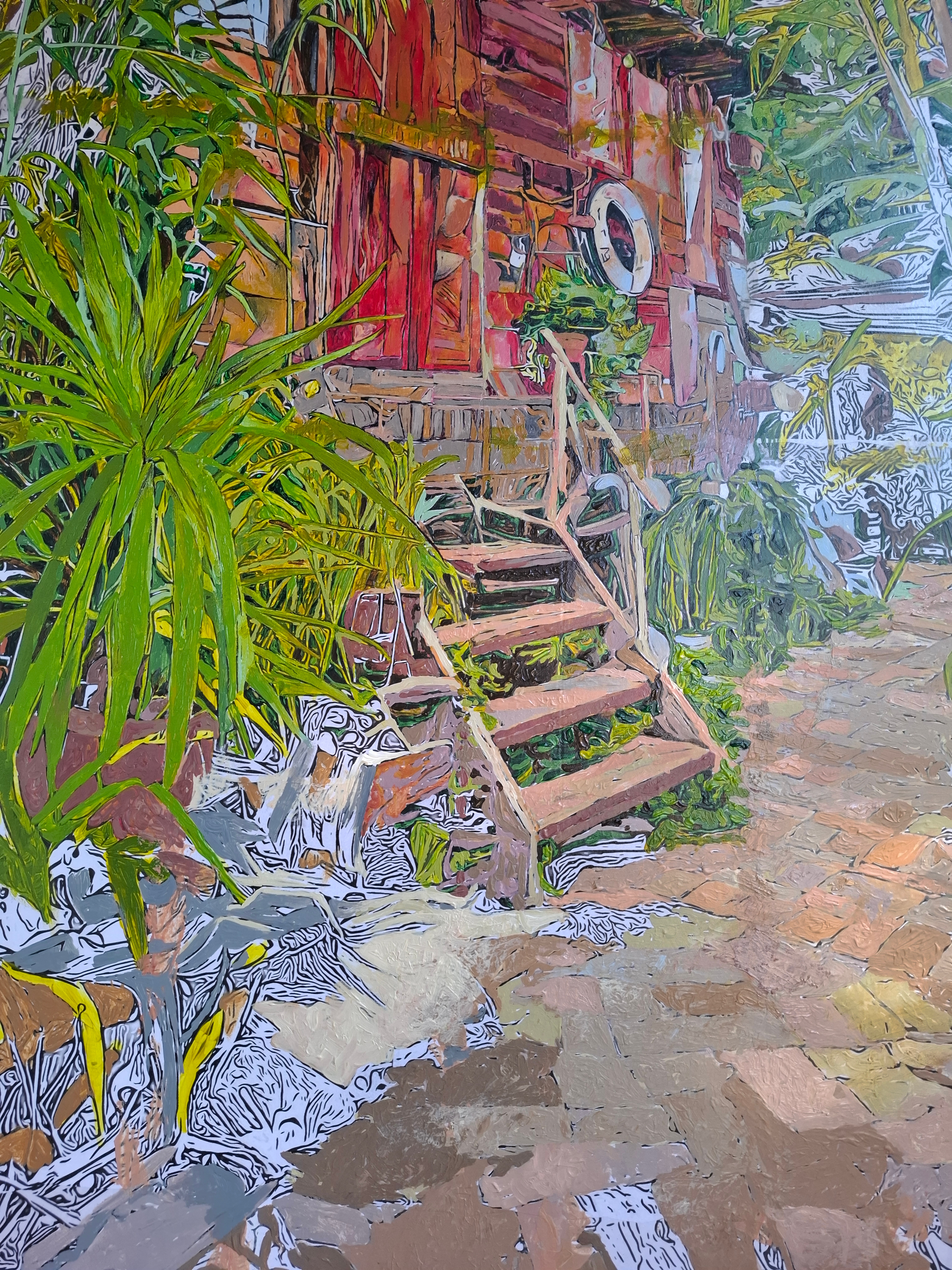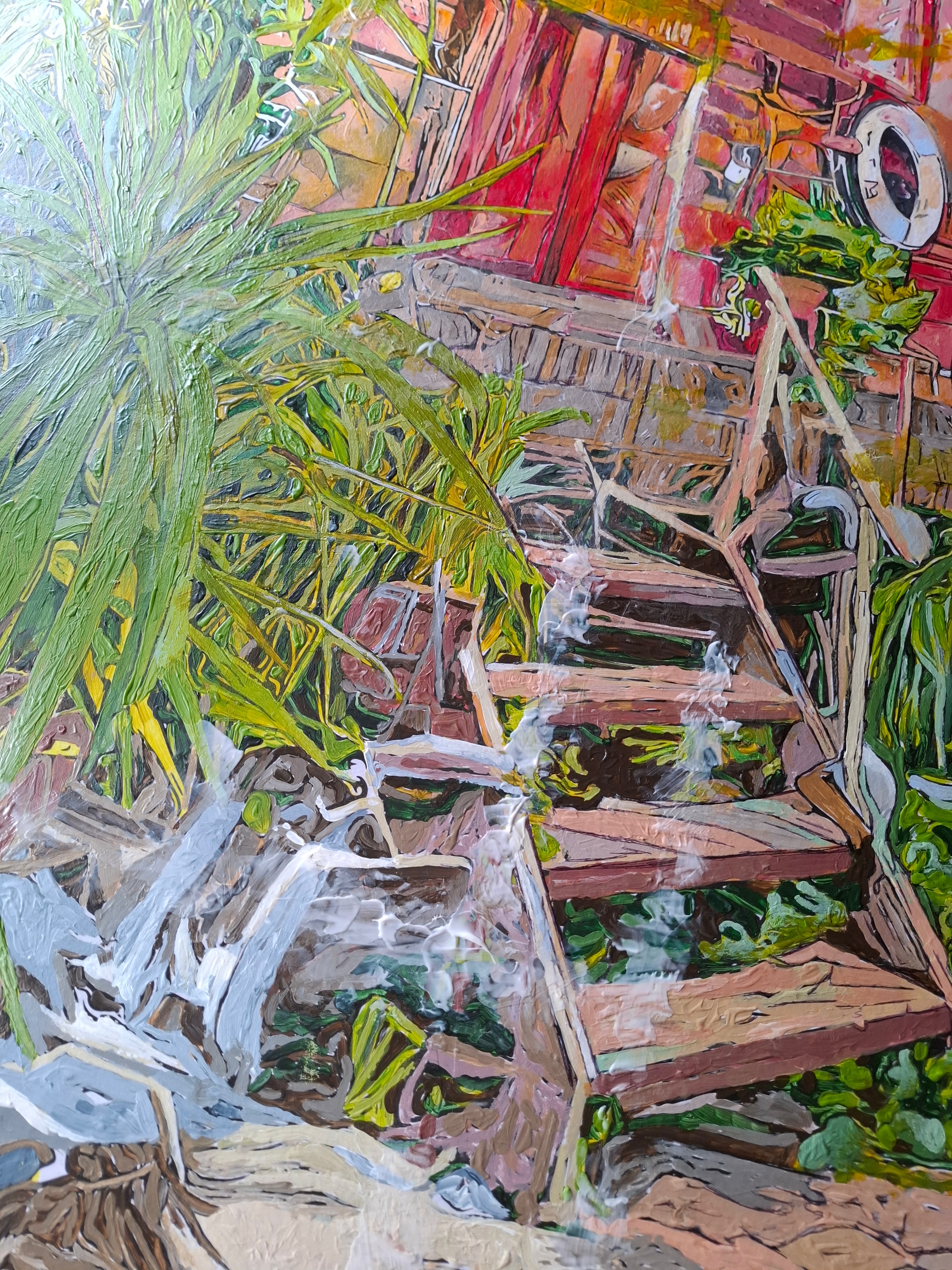 It gave me the inspiration to paint larger works onto canvas but using the them of quirky gardens and workspaces. As we walked around the island it felt so familiar and after half an hour it came to me that it reminded me of our visits to the Bahamas and the The Great Guana Cay Islands and the community feeling and remoteness but relaxed atmosphere. It is so different to anywhere else in London just by crossing a small footbridge.